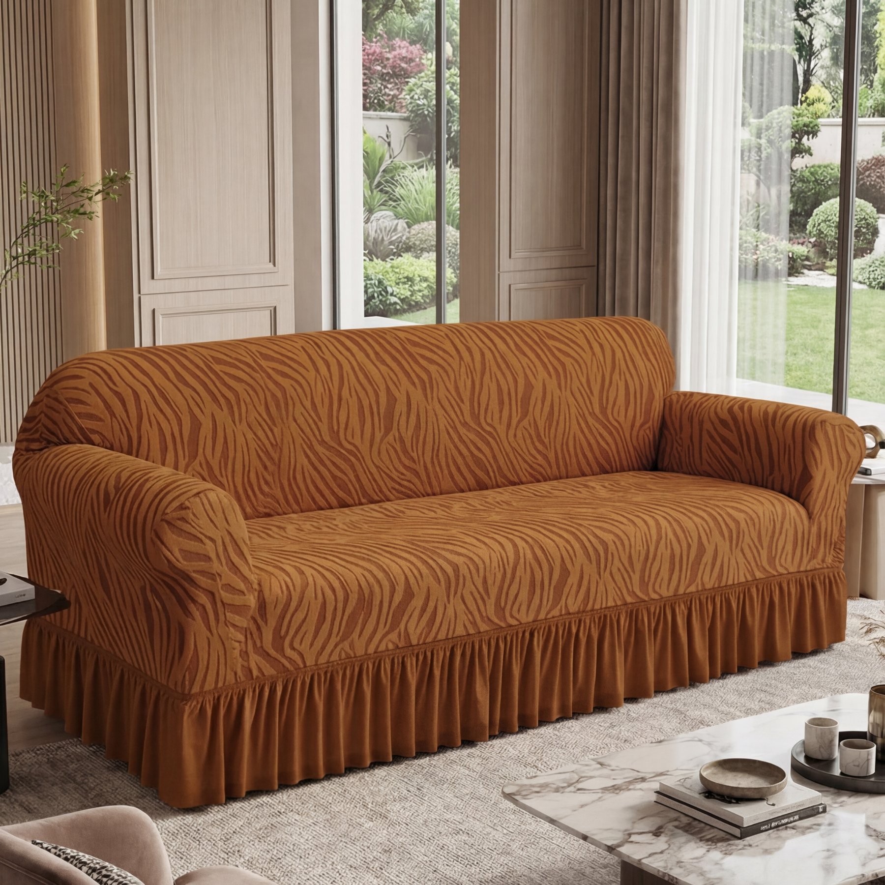 Update your living room effortlessly with this luxurious wave-shaped skirt sofa cover. Offering full coverage, it wraps your furniture in a sophisticated, tailored design, enhancing your décor while adding comfort and warmth—making your sofa feel brand new.