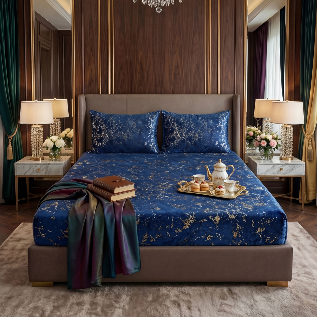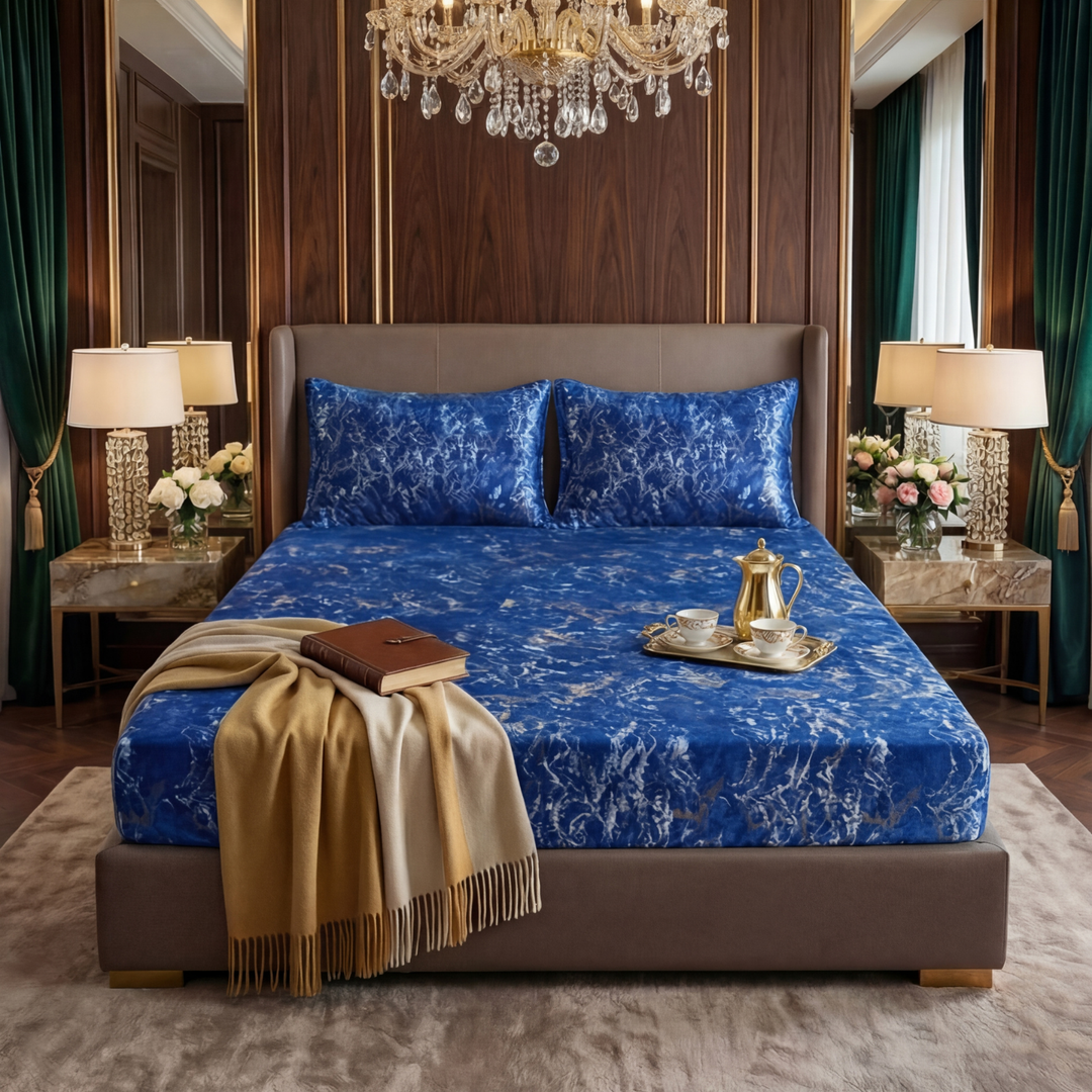 FLOWER/BLUE VELVET fitted bedsheet - (premium)